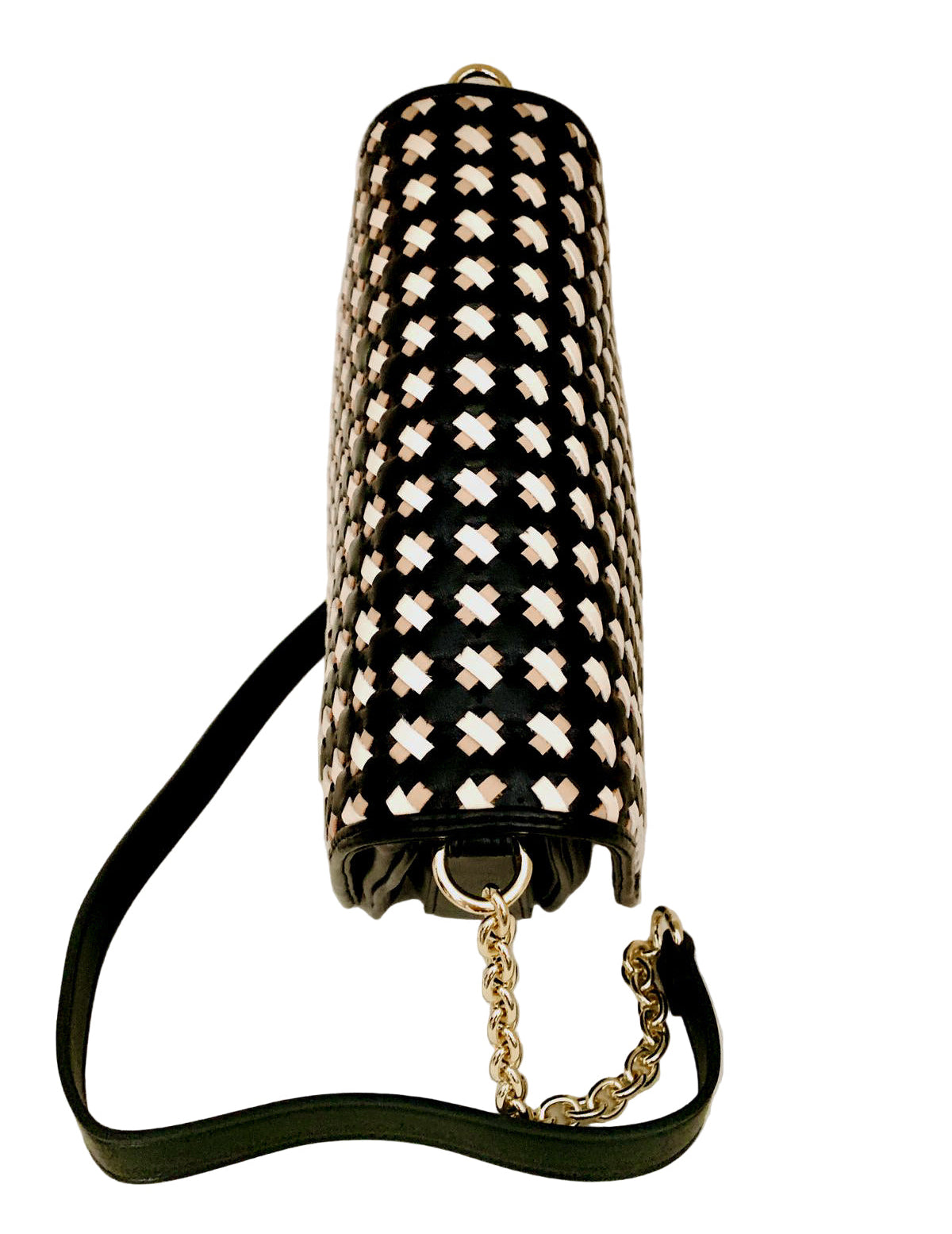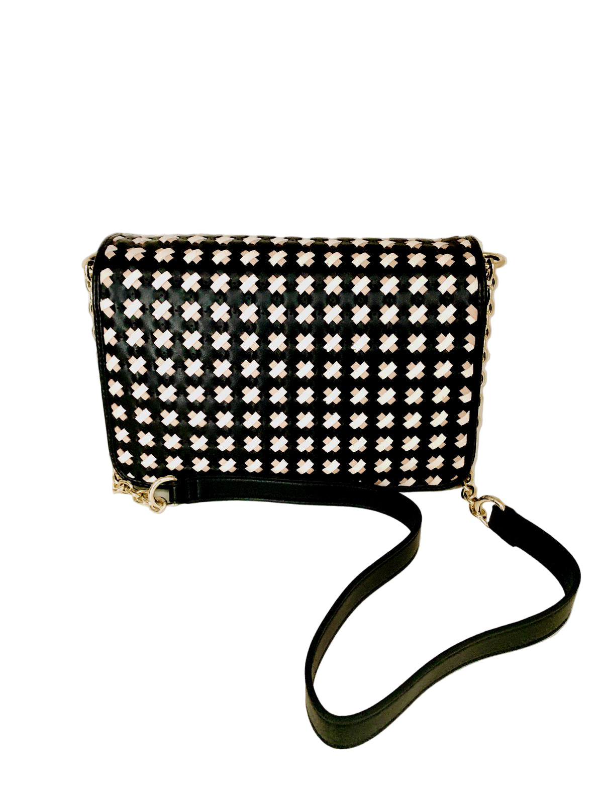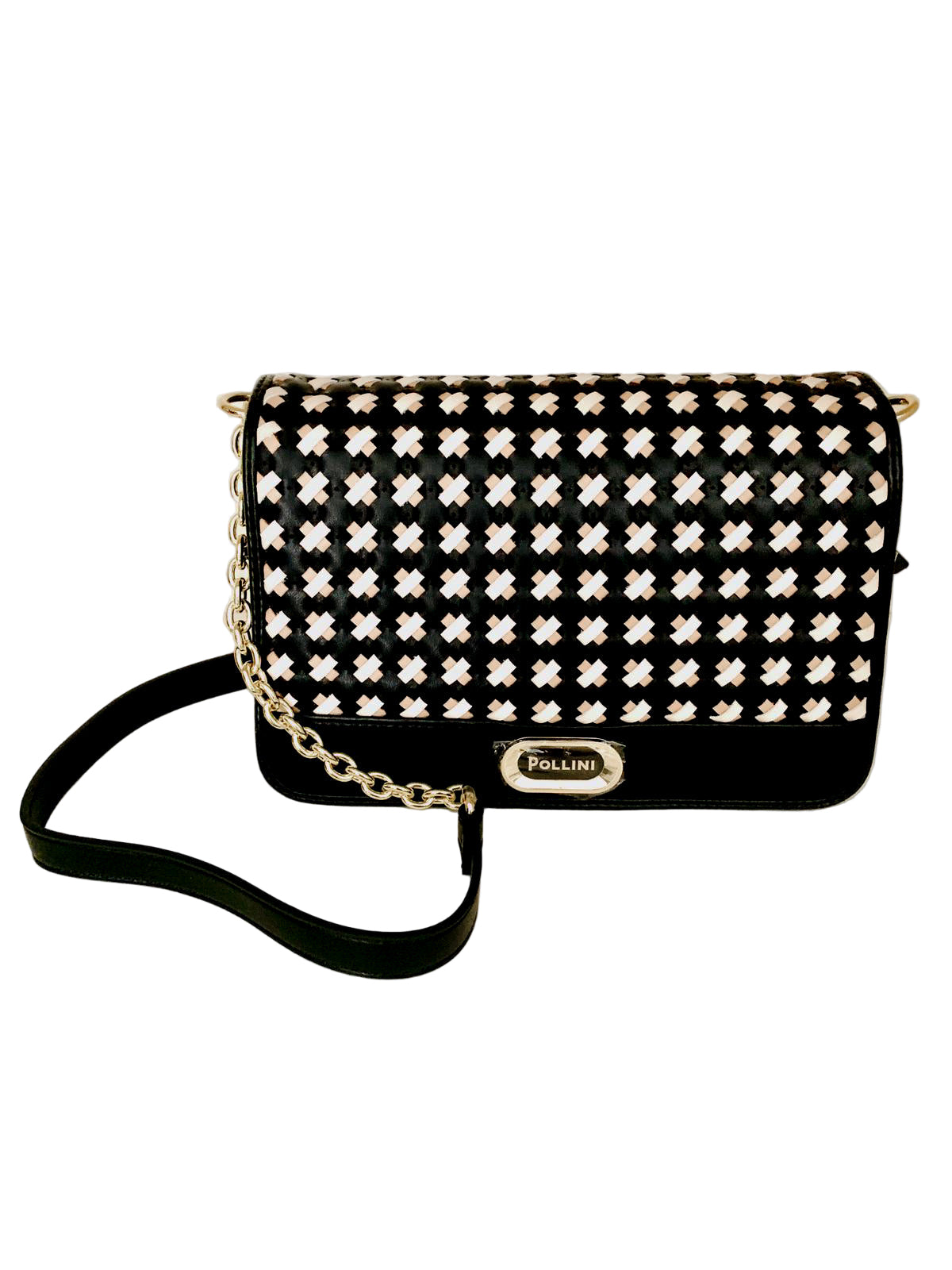 Borsetta con tracolla in pelle nera, chiusura a zip, motivo intrecciato, dettagli oro.